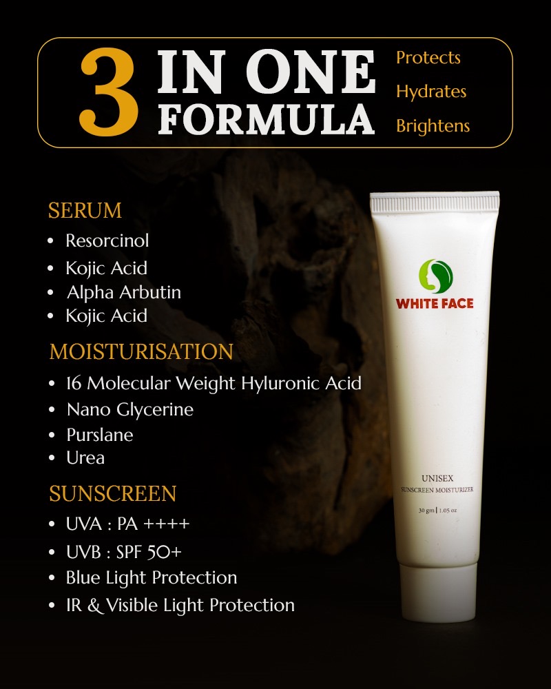 A revolutionary Formula designed for everyone who seeks visible . Reliable Sun protection with added Skin care benefits Boasting SPF 50PA+++, This unique MOISTURIZER Shields Against harmful UVA and UVB Rays . Its more than just a sunscreen- its a daily essential for healthy , radiant complexion
